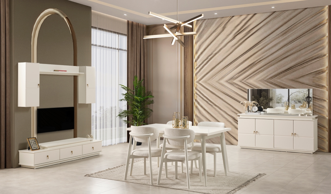 Masal Yemek Odası, zarif tasarımı ve sıcak detaylarıyla şık ve ferah bir yemek alanı sunar. Uyumlu mobilyaları sayesinde estetik ve konforu bir arada sağlar.