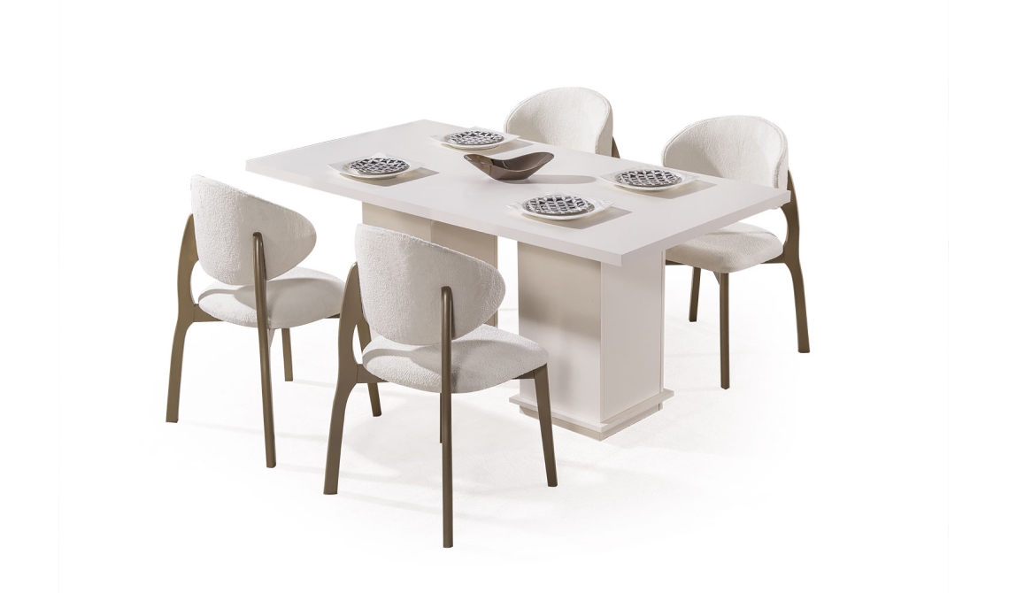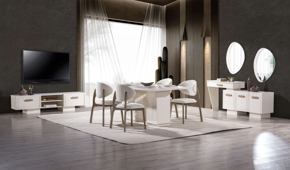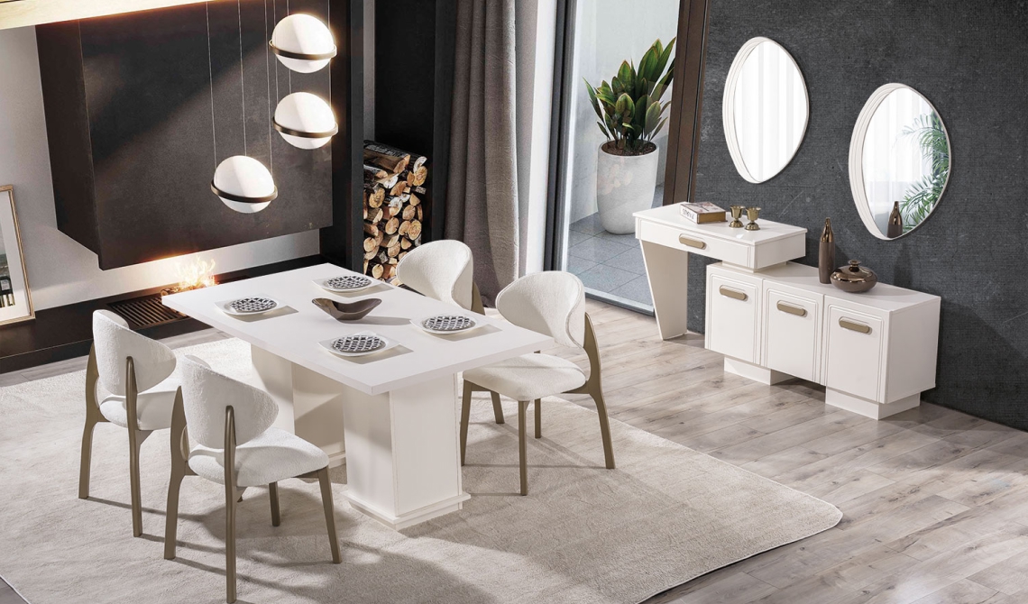 Nova Yemek Odası, modern tasarımı ve uyumlu detaylarıyla şık ve ferah bir yemek alanı sunar. Fonksiyonel mobilyaları sayesinde hem estetik hem de konforlu bir kullanım sağlar.
