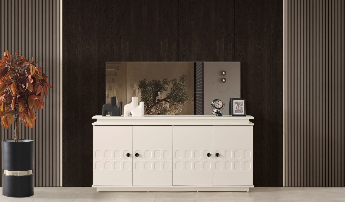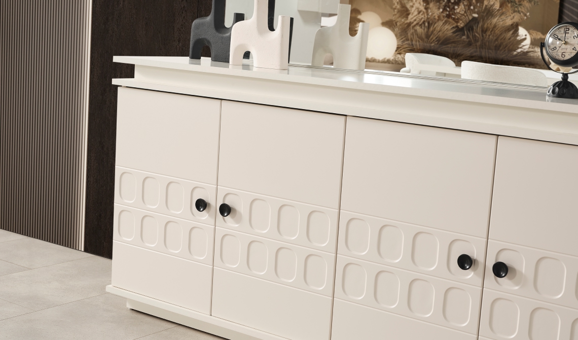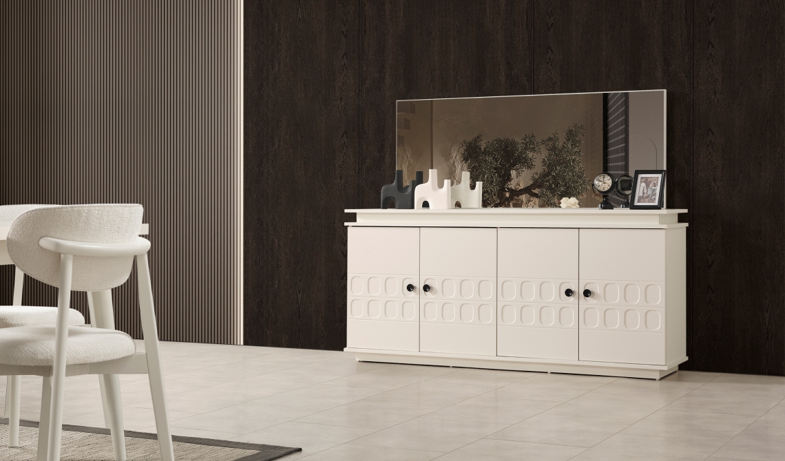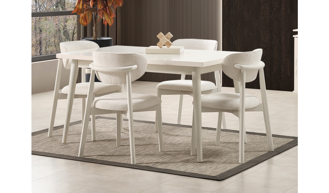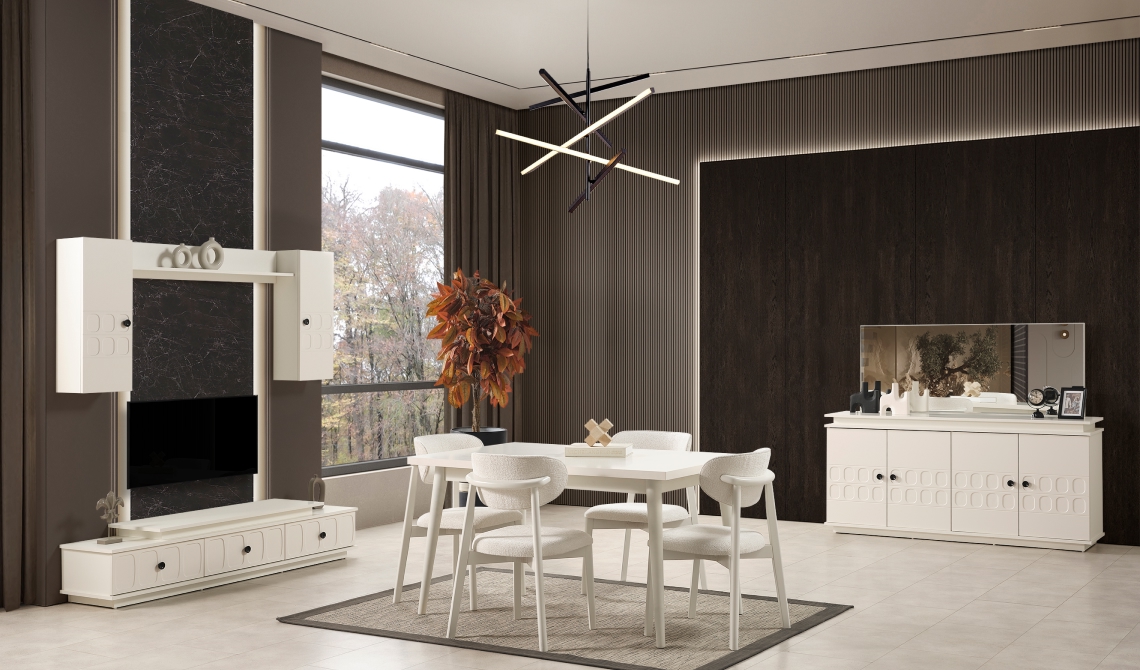 Petek Yemek Odası, sade ve modern tasarımıyla ferah bir yemek alanı sunar. Uyumlu mobilyaları ve fonksiyonel yapısıyla estetik ve konforu bir arada sağlar.